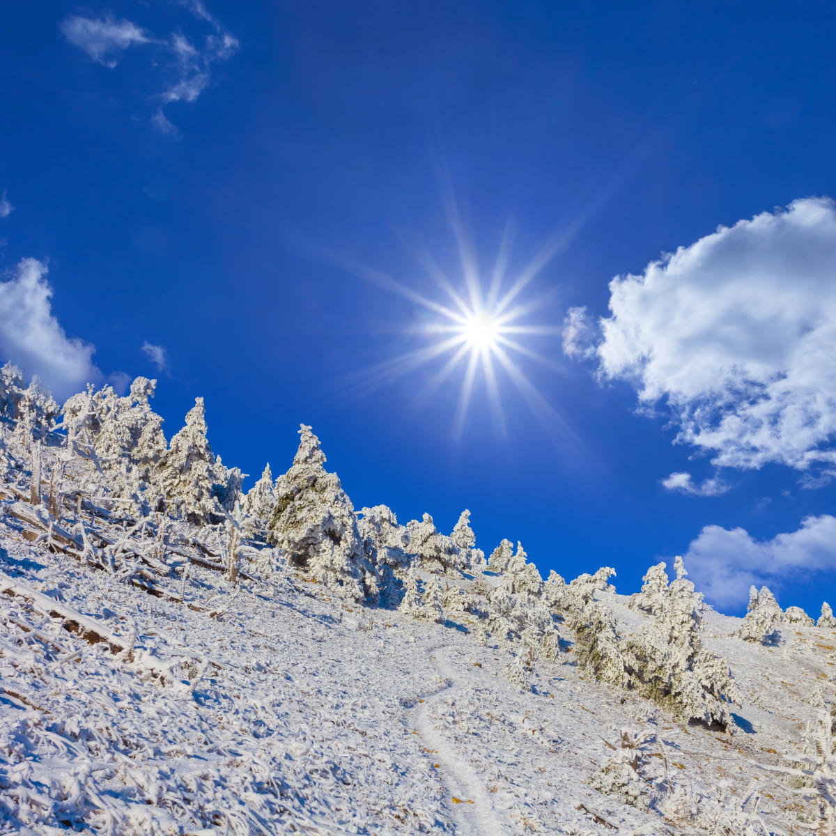 冰天雪地,世界一片洁白.太阳躲在雪树背后,洒下温暖的光芒.